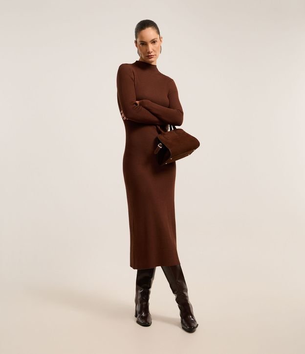 Vestido Long Midi em Tricô com Gola Alta Marrom