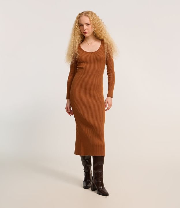 Vestido Long Midi em Tricô com Textura e Fenda Marrom