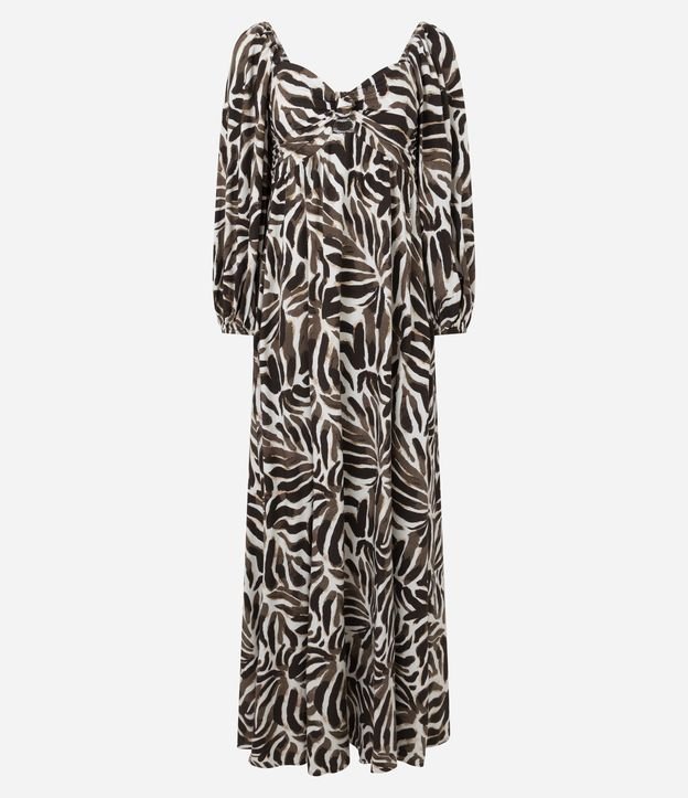 Vestido Long Midi em Viscose com Estampa de Folhagens Marrom