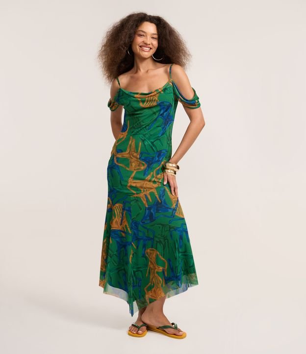 Vestido Long Midi Evasê em Tule com Estampa de Cadeiras Verde/Laranja/Azul