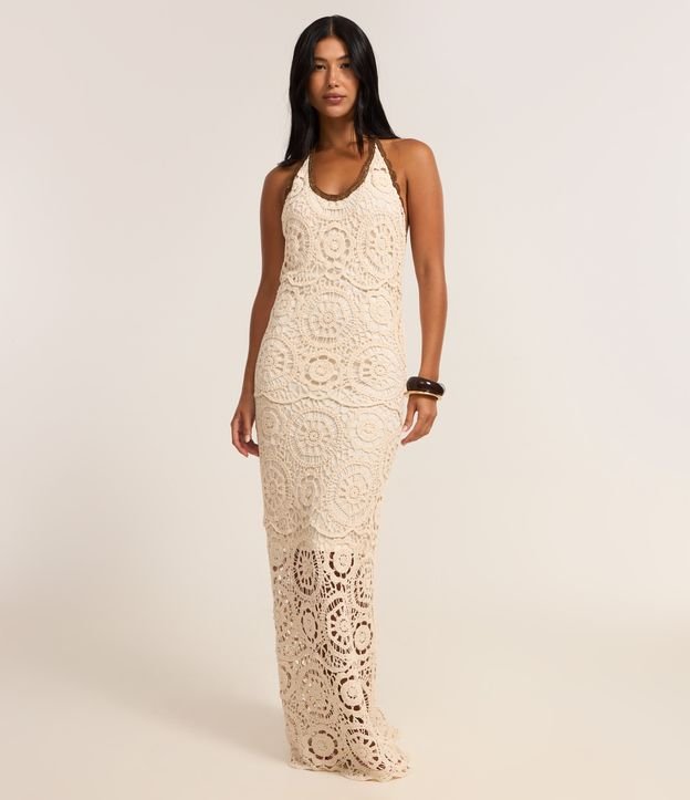 Vestido Long Midi Frente Única em Tricô com Efeito Crochê Bege