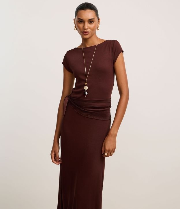 Vestido Longo Canelado em Ribana com Fenda Marrom