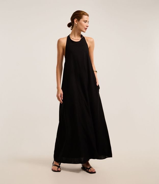 Vestido de comprimento longo, sem mangas, confeccionado em viscose com 28% de linho, com amarração no pescoço e costas abertas. A parte do decote e das cavas tem design de regata nadador. Este produto possui viscose certificada em sua composição, além de ter sido produzido através de processos mais sustentáveis com boas práticas ambientais, sendo ambientalmente mais responsável.
