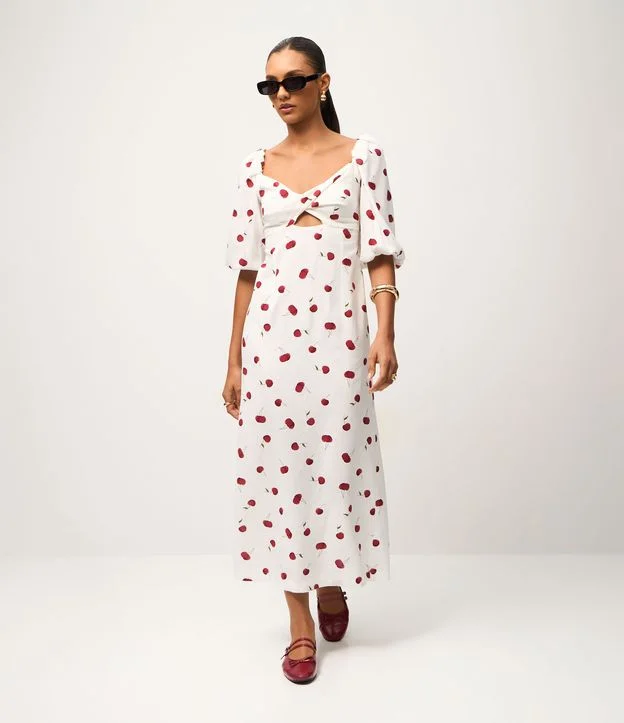 Vestido longo feminino confeccionado em viscose certificada através de boas práticas ambientais. Possui estampa de cerejas, decote levemente drapeado com recorte torcido, mangas bufantes com elástico nos punhos, busto estruturado com franzido e parte traseira com lastex para ajuste.