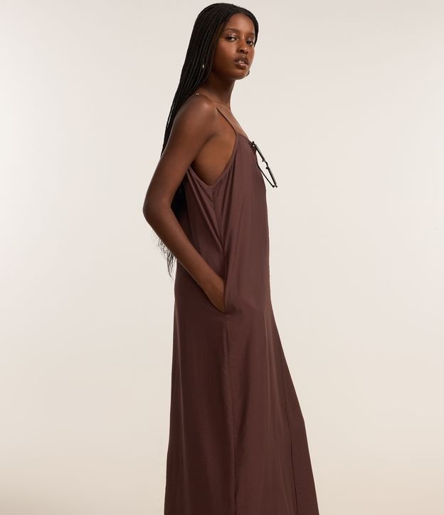 Vestido Longo e Reto em Crepe com Bolsos Marrom