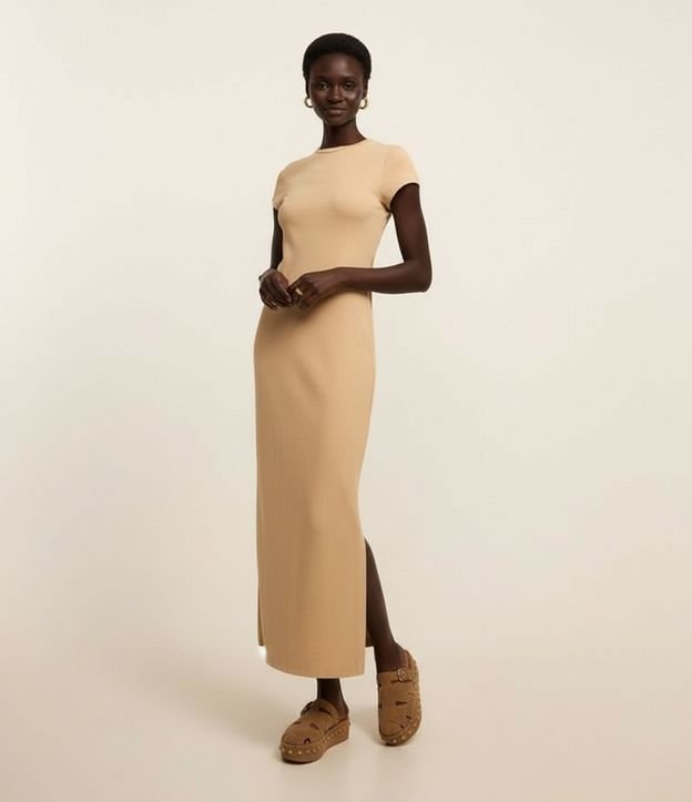 Vestido Longo em Algodão com Manga Curta Bege