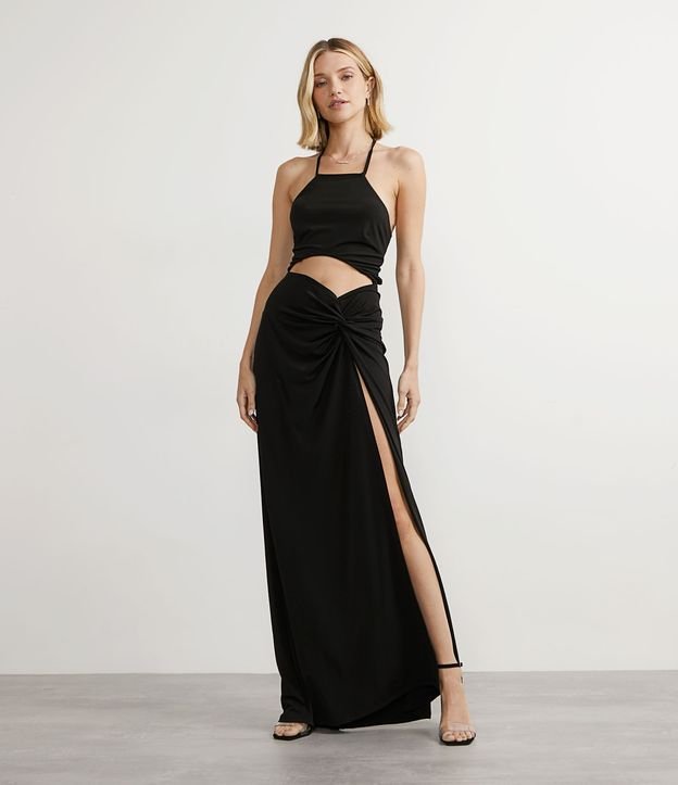 Vestido Longo em Malha Crepe com Gola Halter e Abertura Frontal