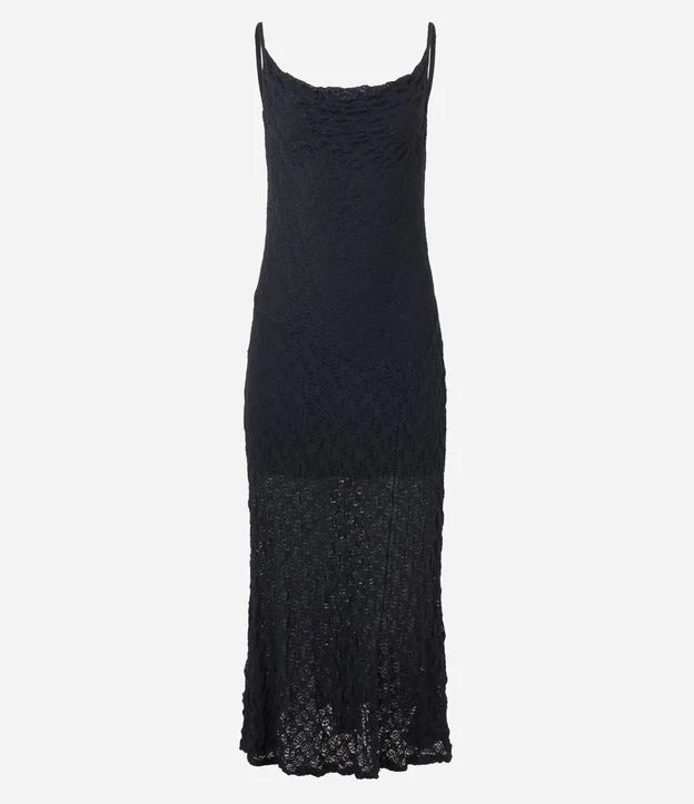 Vestido feminino confeccionado em renda, sem mangas, com alças finas e decote degagê que valoriza o colo com elegância. A modelagem evasê e o comprimento longo abaixo do joelho proporcionam movimento e sofisticação, criando um visual feminino e refinado, ideal para ocasiões especiais e produções elegantes do dia à noite.