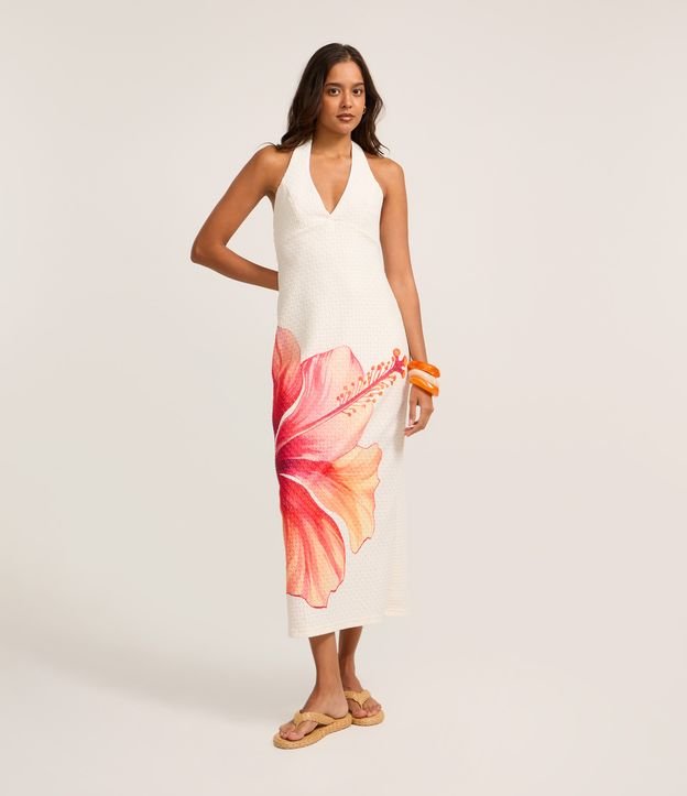 Vestido Longo em Renda com Estampa Floral Hibisco Branco
