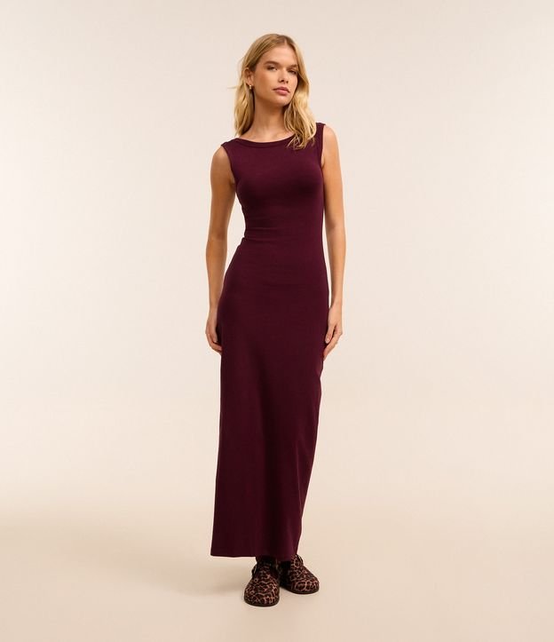 Vestido longo com decote halter nas costas, sem manga e confeccionado em ribana com algodão bci mais sustentável.