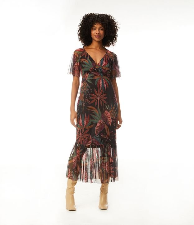 Vestido Longo em Tule com Estampa de Folhagens com Babado