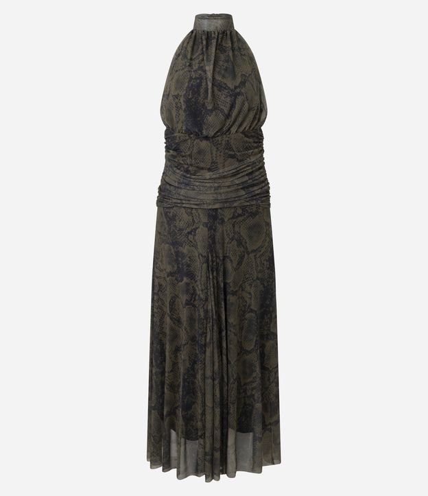 Vestido feminino em tule confeccionado com poliéster mais sustentável. Possui estampa animal print, modelagem longa, sem mangas, decote halter com amarração posterior e drapeado marcado na cintura.