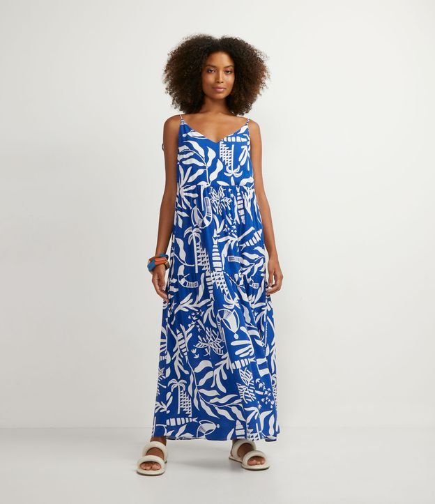 Vestido Longo em Viscose com Estampa de Desenhos Figurativos