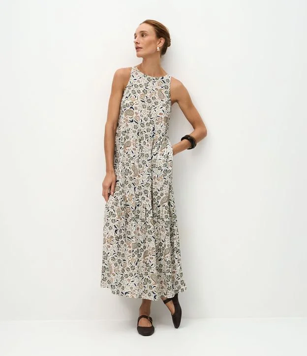 Vestido feminino longo em viscose mais sustentável. Possui modelagem ampla, gola halter ajustada ao pescoço, estampa com desenhos florais por toda a peça, recorte franzido na altura da cintura e caimento fluido.