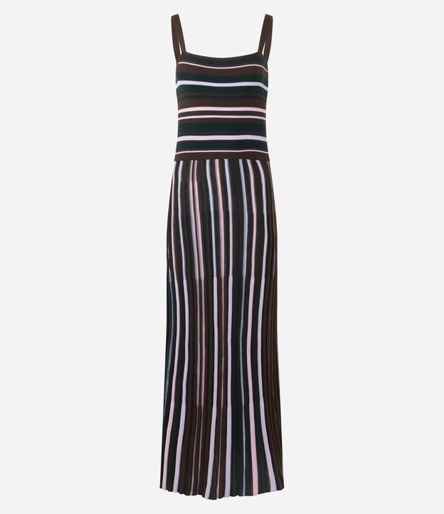 Vestido Longo Evasê em Tricô Listrado com Decote Quadrado Marrom