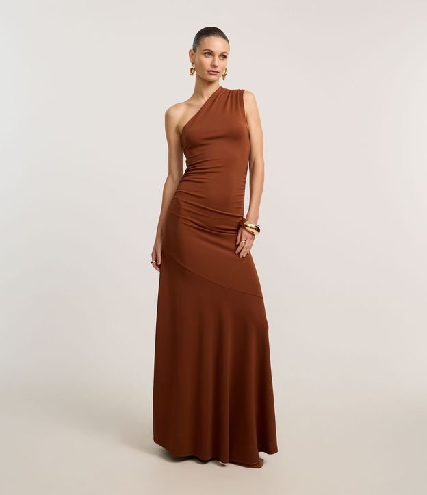 Vestido Longo Ombro Só em Microfibra com Recorte Diagonal Marrom
