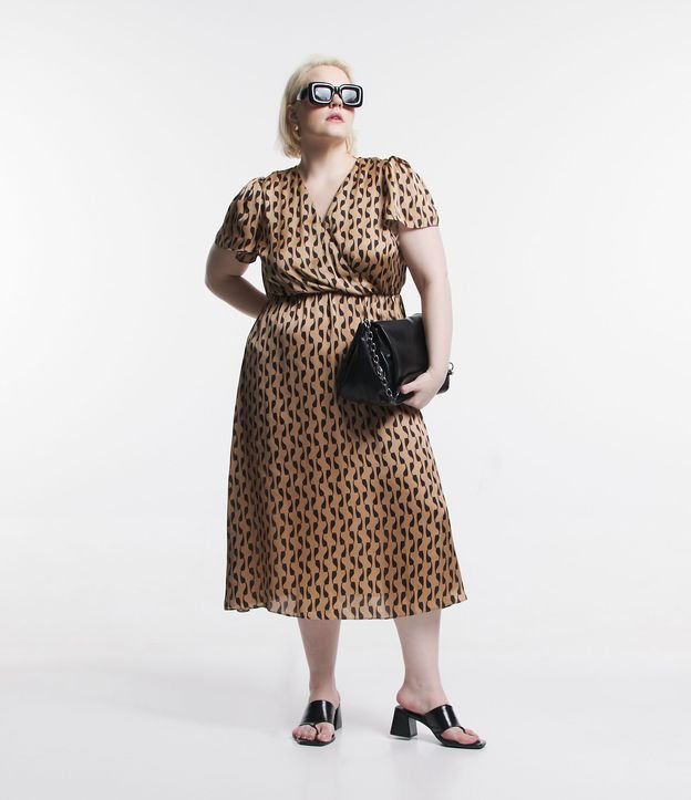 Vestido Midi Acetinado com Estampa Geométrica e Manga Godê Curve & Plus Size