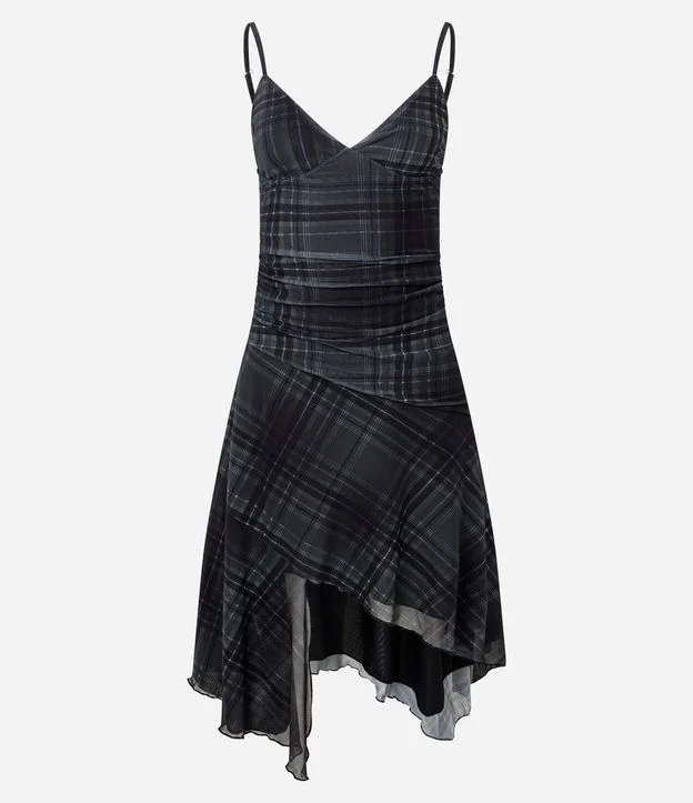 Vestido Midi Alcinha em Tule Xadrez com Barra Assimétrica Preto