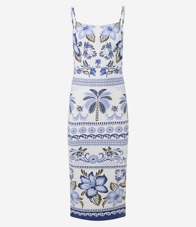 Vestido midi em viscose com estampa floral em tons de azul, alças finas e decote quadrado. Modelo ajustado que valoriza a silhueta com caimento leve e confortável. Ideal para compor looks frescos e modernos, confeccionado em algodão de certificado BCI.