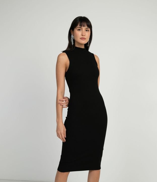 Vestido Midi Básico em Algodão Canelado com Gola Alta