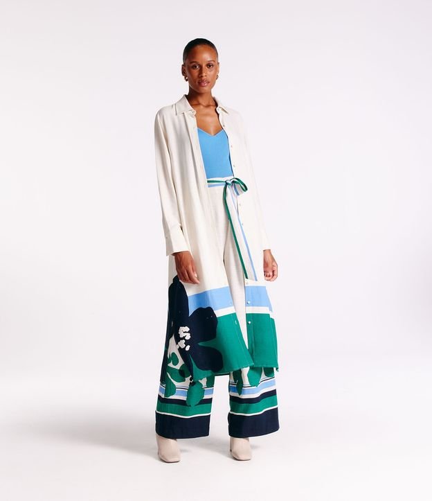 Vestido Midi Chemise em Viscolinho com Estampa Floral Lateral e Listras Contrastantes