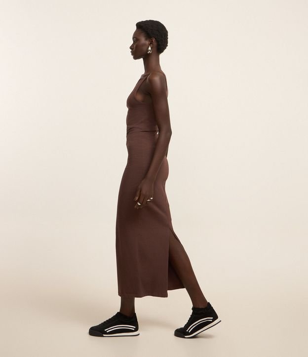 Vestido de modelo midi, confeccionado em material mais sustentável. Possui alças finas, decote reto e fenda traseira.