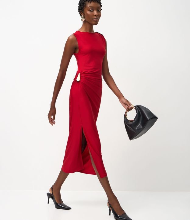 Vestido Midi com Aviamento em Gota e Fenda Lateral Vermelho