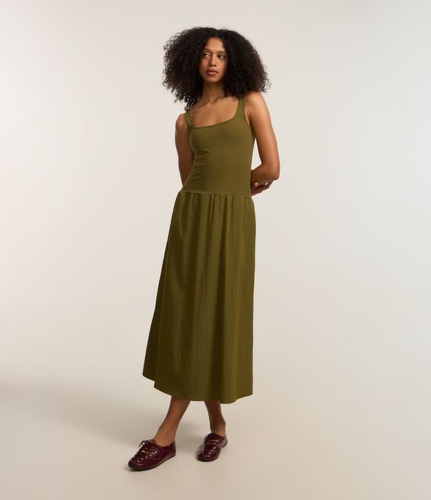Vestido Midi com Corpo de Ribana e Saia Rodada Verde