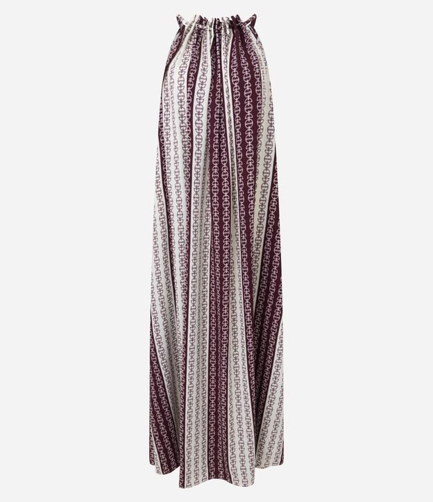 Vestido feminino midi em crepe com estampa geométrica. Possui decote halterneck com amarração no pescoço, franzido frontal e modelagem solta, oferecendo caimento fluido e acabamento leve para produções versáteis.
