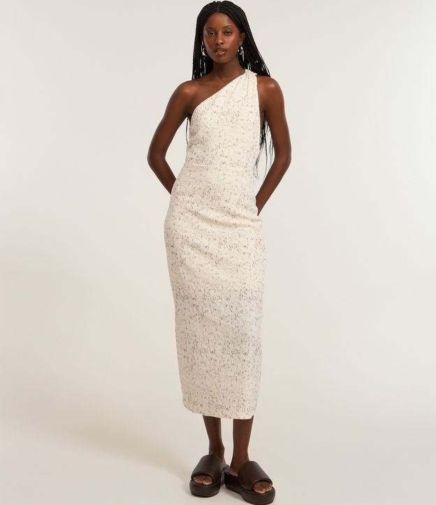 Vestido midi com decote um obro só, sem manga, confeccionado em poliéster com elastano e texturizada.