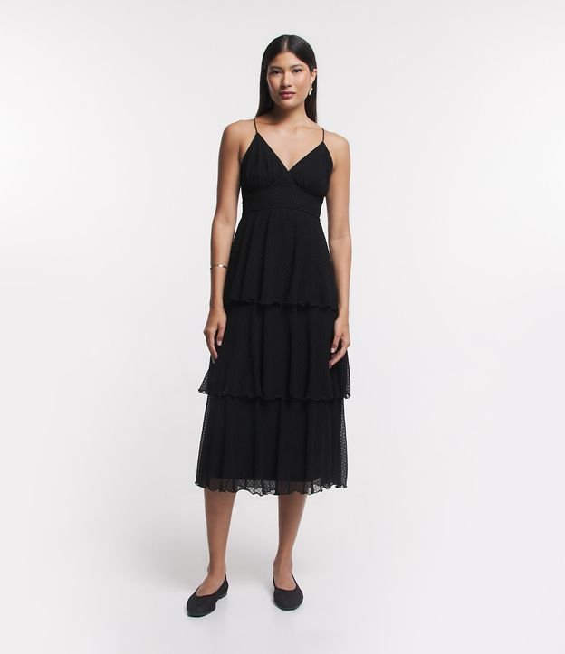 Vestido Midi de Alça em Tule Texturizado com Sobreposições