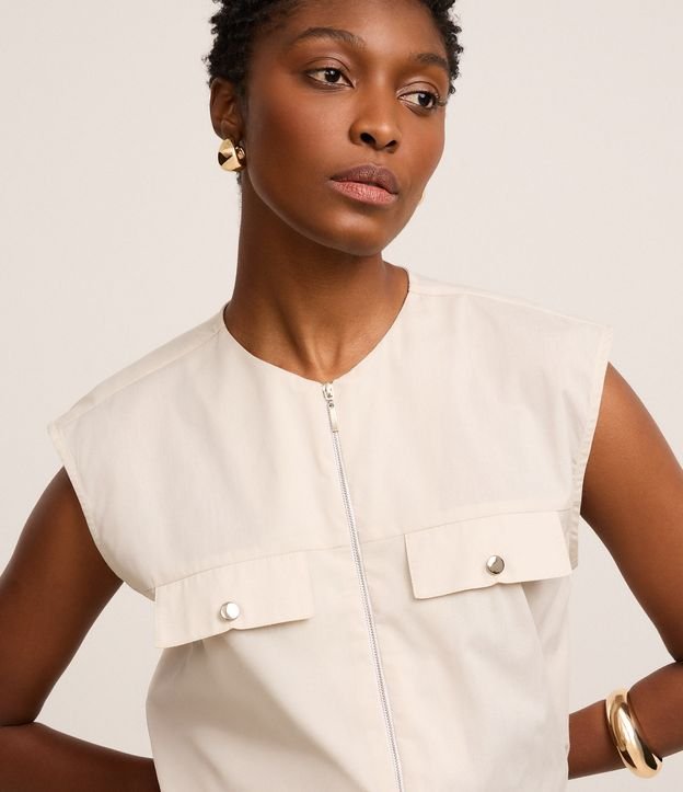 Vestido feminino confeccionado em tricoline com melhores práticas ambientais, peça com gola redonda, sem manga, abertura frontal por zíper, lapela com botão e cintura com elástico.