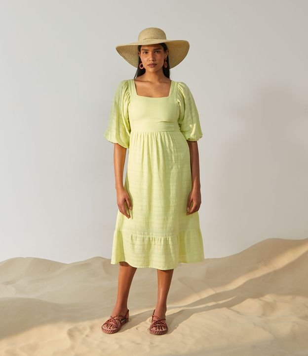 Vestido Midi em Algodão com Decote Quadrado e Mangas Bufantes