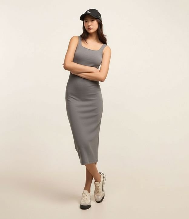 Vestido Midi em Algodão com Decote Quadrado Cinza