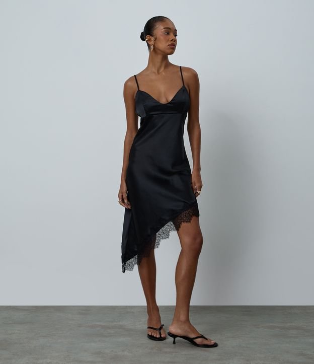 Vestido Midi em Cetim com Renda e Barra Assimétrica Preto