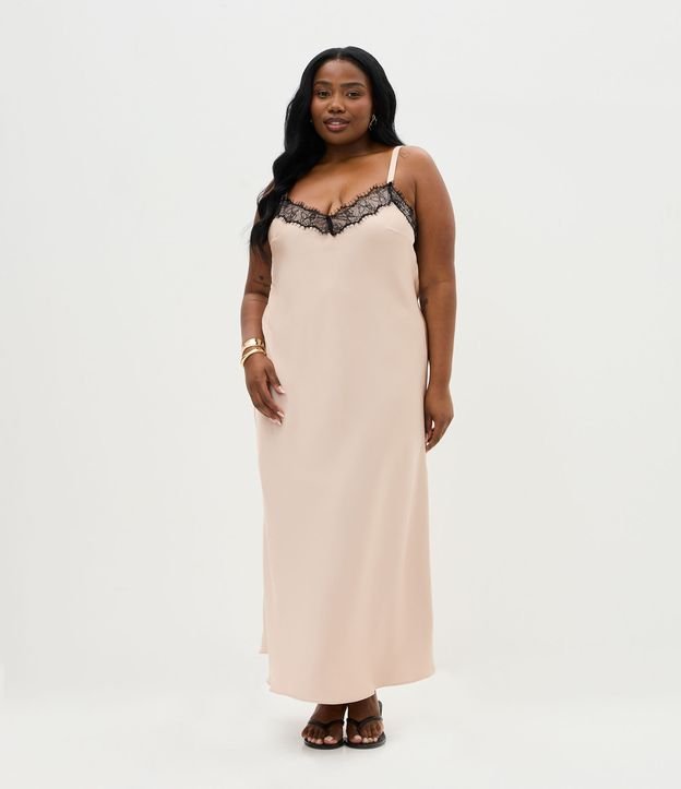 Vestido Midi em Cetim com Renda no Decote Curve & Plus Size Bege