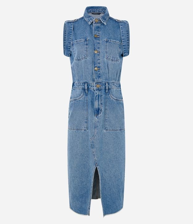 Vestido Midi em Jeans com Bolsos e Barra Desfiada