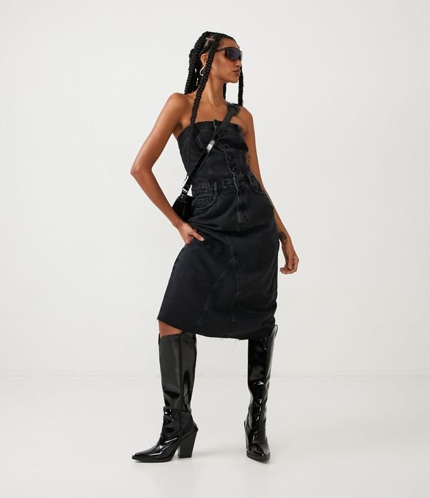 Vestido Midi em Jeans com Decote Tomara Que Caia e Fenda
