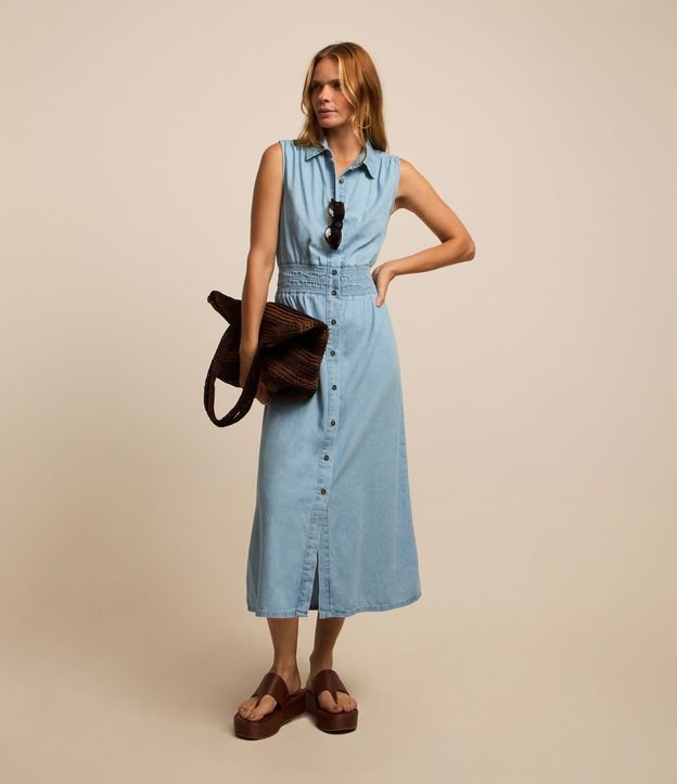 Vestido new midi com gola colarinho, sem mangas, confeccionado em jeans e com lastex na cintura.