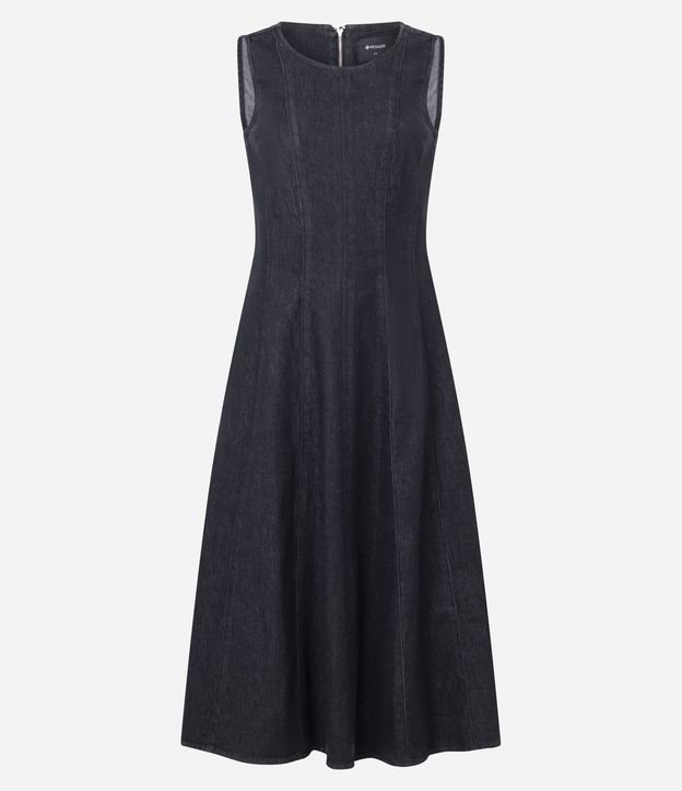 Vestido midi confeccionado em jeans raw com modelagem evasê que proporciona caimento amplo e elegante. Possui gola redonda, design sem mangas e recortes verticais que valorizam a silhueta, além de zíper traseiro invisível. Confeccionado em algodão certificado BCI.