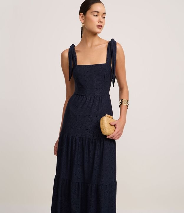 Vestido Midi em Laise com Amarração nos Ombros Azul