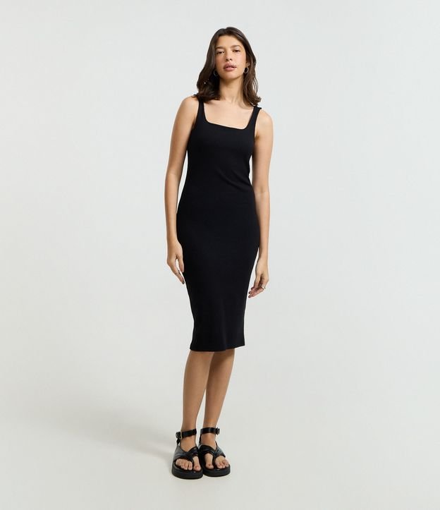 Vestido Midi em Ribana com Decote Quadrado Preto