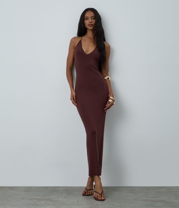 Vestido Midi em Tricô com Decote V e Renda nas Costas Marrom