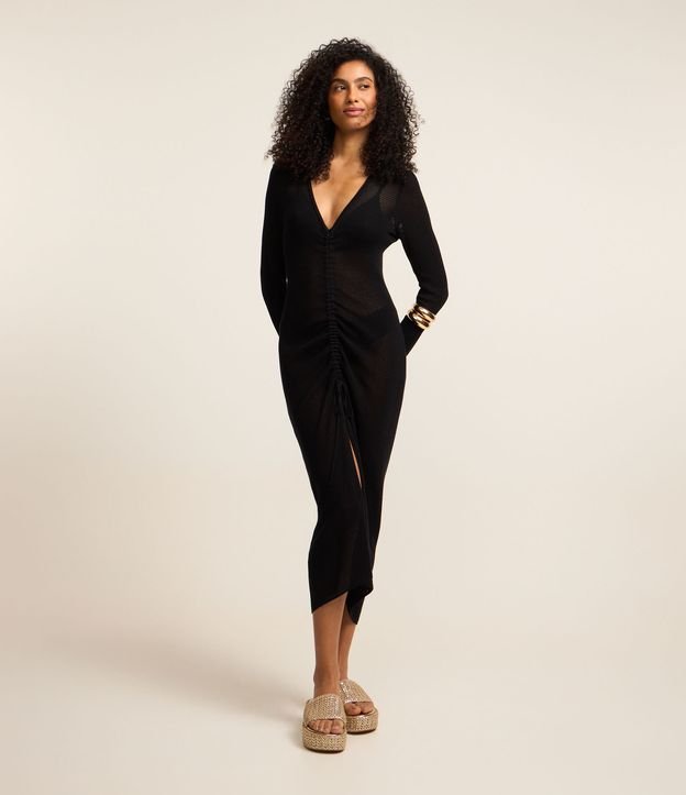 Vestido Midi em Tricô com Franzido e Fenda Preto