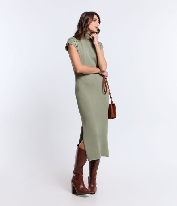 Vestido em tricô modelo midi, com gola alta dobrada, manga curta sem cava e detalhe de fendas laterais.