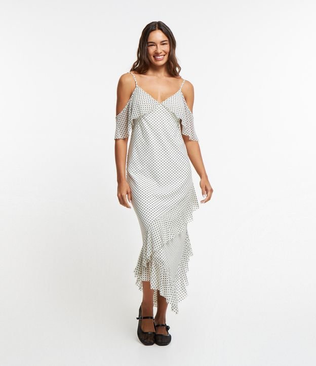 Vestido Midi em Tule com Babados Assimétricos e Estampa Poá