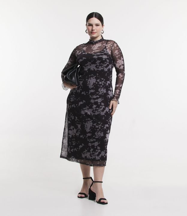 Vestido Midi em Tule com Golinha Alta e Estampa Manchas Curve & Plus Size