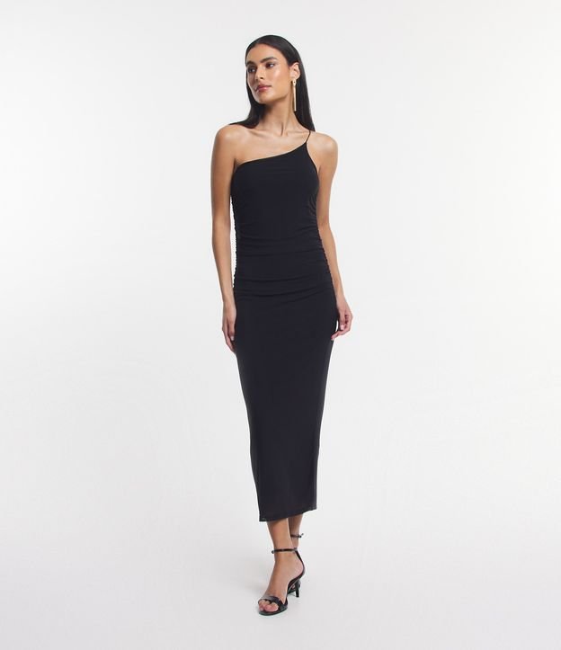 Vestido Midi em Tule com Ombro Só e Franzidinho Lateral