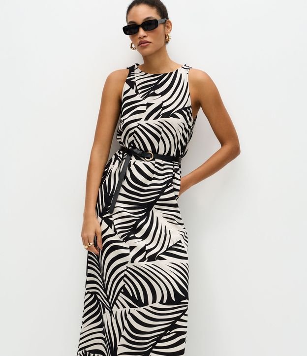 Vestido Midi em Viscolinho com Estampa de Folhagens Branco/Preto