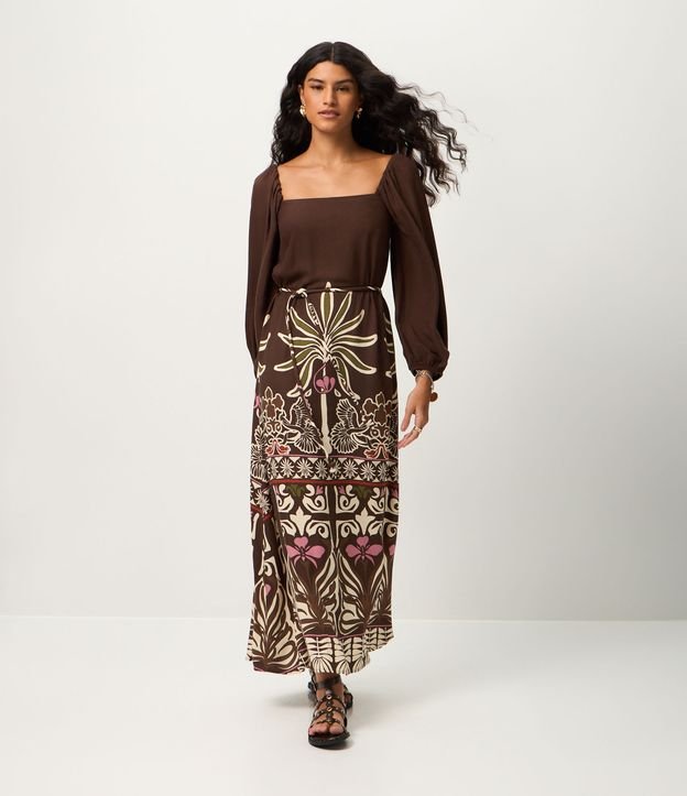 Vestido Midi em Viscose com Estampa de Folhagem Marrom